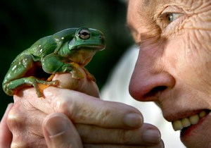 Going, going … primatologist Dr Jane Goodall with a Splendid Tree Frog at Adelaide Zoo. Adelaide, Berlin, London and San Francisco Zoos are starting a frog insurance program because they are dying out all over the world due to climate change.