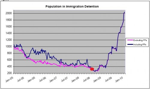 The graph actually shows the number of asylum seekers in immigration detention in Australia. The red spot shows the point where our glorious leader, Saint Kevin of Rudd, emasculated the previous Howard government’s policy. Boats are arriving on a daily basis. I wonder why? Is it because the word got out that Australia had overnight become a soft touch, and so you’re better off trying to get in there rather than anywhere else? At a time when global asylum seeker numbers are actually falling?