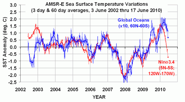 Sea Surface Temperatures (SSTs) measured by the AMSR-E instrument on NASA’s Aqua satellite continue their plunge as a predicted La Nina approaches. The following plot, updated through yesterday (June 17, 2010) shows that the cooling in the Nino34 region in the tropical east Pacific is well ahead of the cooling in the global average SST, something we did not see during the 2007-08 La Nina event: