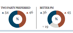 The Coalition’s primary vote, after falling sharply two weeks ago because of internal divisions, bounced back to 45 per cent. This is the Coalition’s highest primary vote since March 2006, when John Howard was prime minister and nine months before Kim Beazley was replaced by Mr Rudd as opposition leader. (source)
