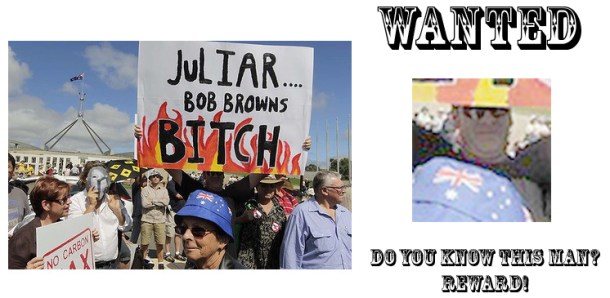 A well-known media organisation has contacted me today asking for help to find the person behind the Brown’s Bitch placard which featured so heavily in media images from the carbon tax rally yesterday. As part of that search, I am asking for readers of ACM for help. If you know the person, please ask him to contact us in confidence at ACM (simon@australianclimatemadness.com). There are some journalists who would be very keen to speak to you.