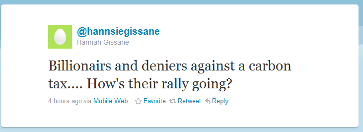 Tim Blair links to a wonderful collection of tweets about the Carbon Tax rally, like this one: