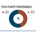 Based on preference flows at the last federal election, the Coalition has a 10-point lead over Labor on a two-party-preferred basis of 55 to 45 per cent. This is the Coalition’s biggest lead after preferences and Labor’s lowest two-party-preferred vote since April 2003, when Kim Beazley declared he wanted to take the Labor leadership because Simon Crean was not making any impact on the Howard government in the polls. (source)