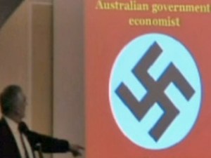 “Heil Hitler, on we go,” said Lord Monckton in discussing Prof Garnaut, as a quote was displayed beside a swastika. (source)