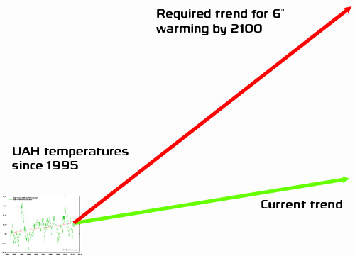But despite emissions growing faster than ever, temperature rises have slowed to a crawl in the last decade or so. A six degree rise by 2100 would require a 0.7 degree rise every decade from now until the end of the century. What happens if we splice this on to the current temperature chart?